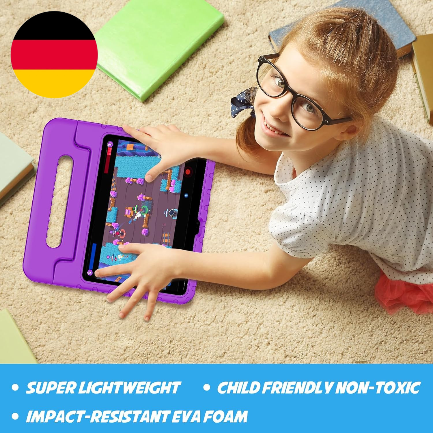 Procase Kinder Hülle Mit Kickstand Für Ipad 10/11 Genaration 2022 2025 (A16) Ultra Leicht Stoßfest Robust Kind Schutzhülle Umwandelbar Handgriff Handle Standfunktion -Lila. Ecken sind mit doppelt dickem Silikon für besten Schutz vor Stößen.