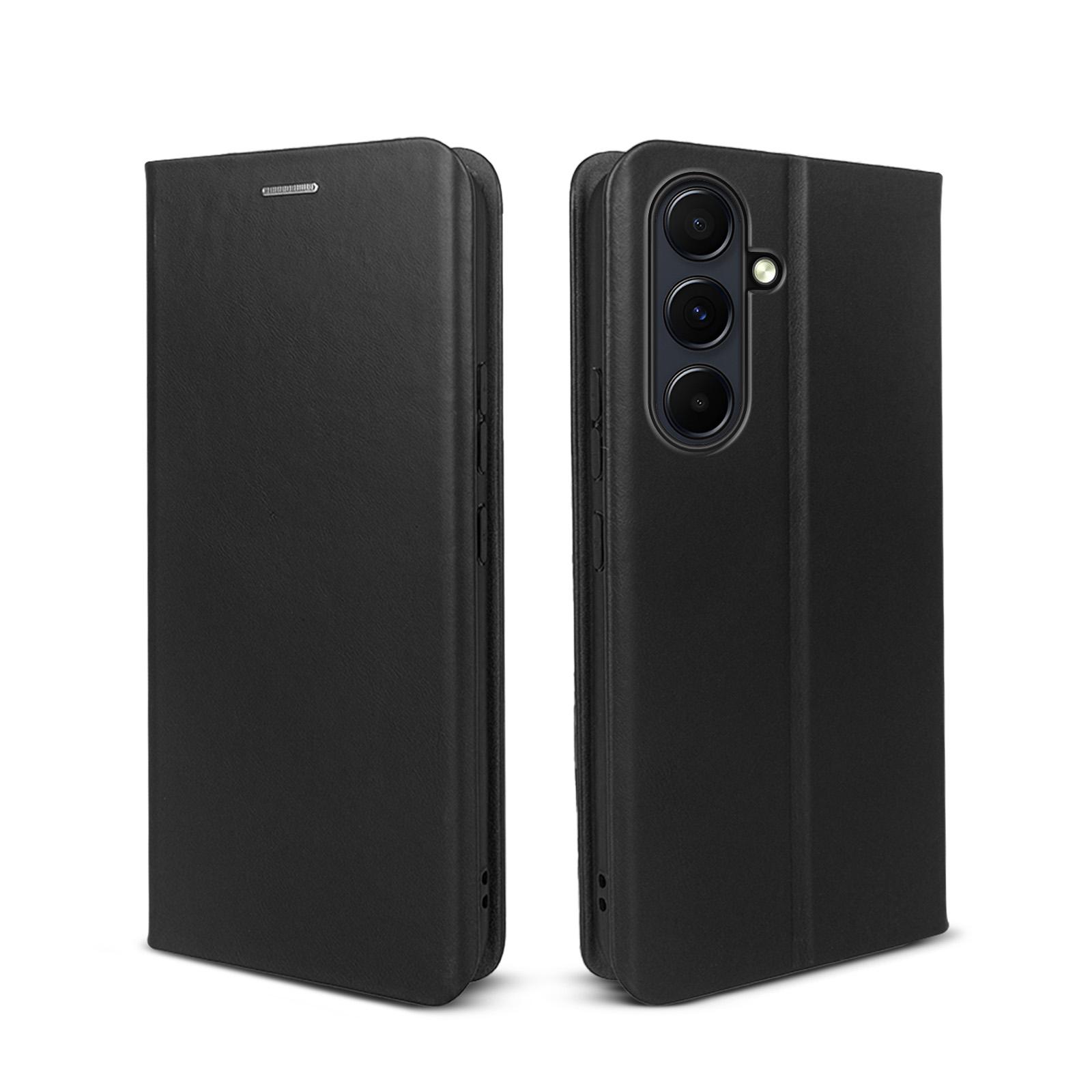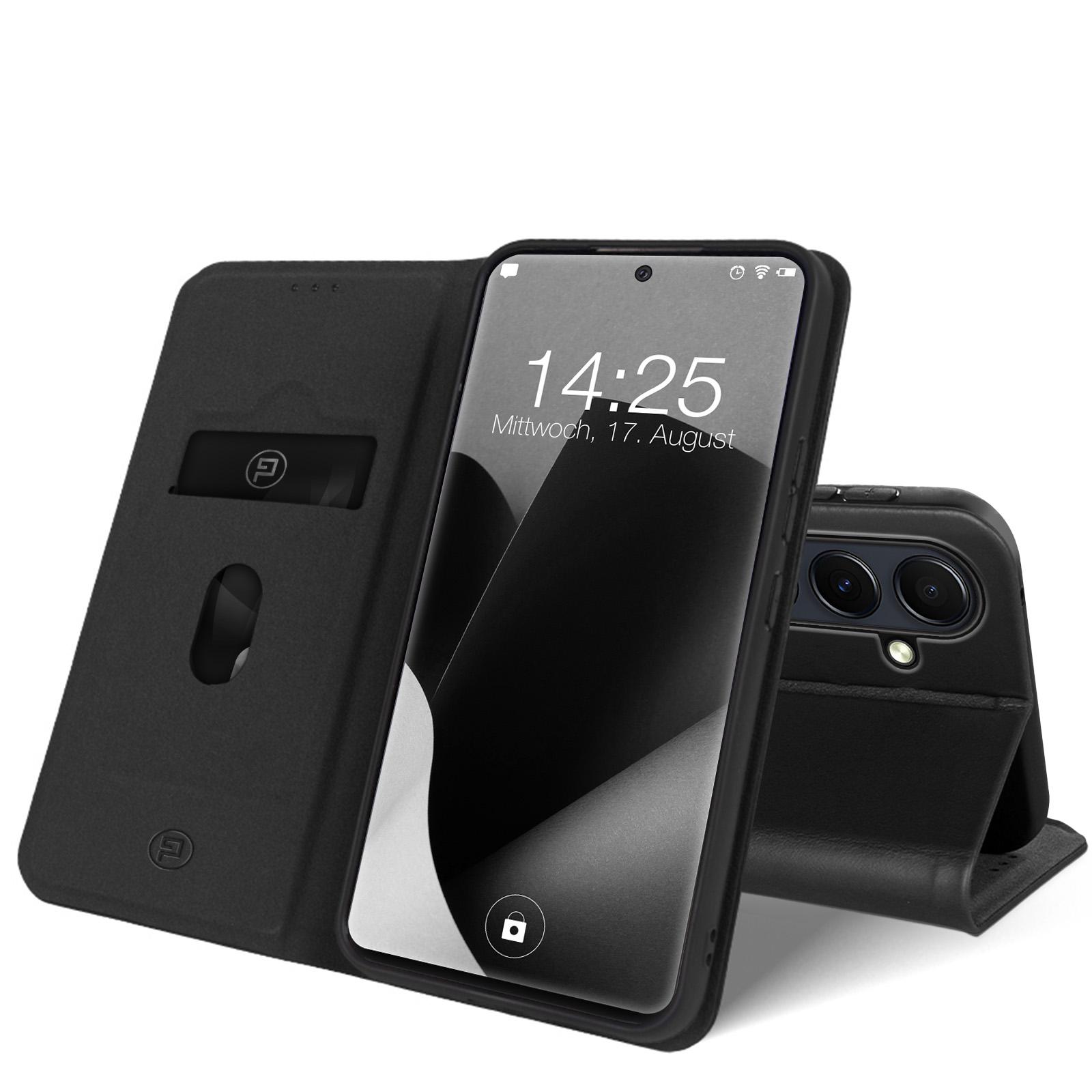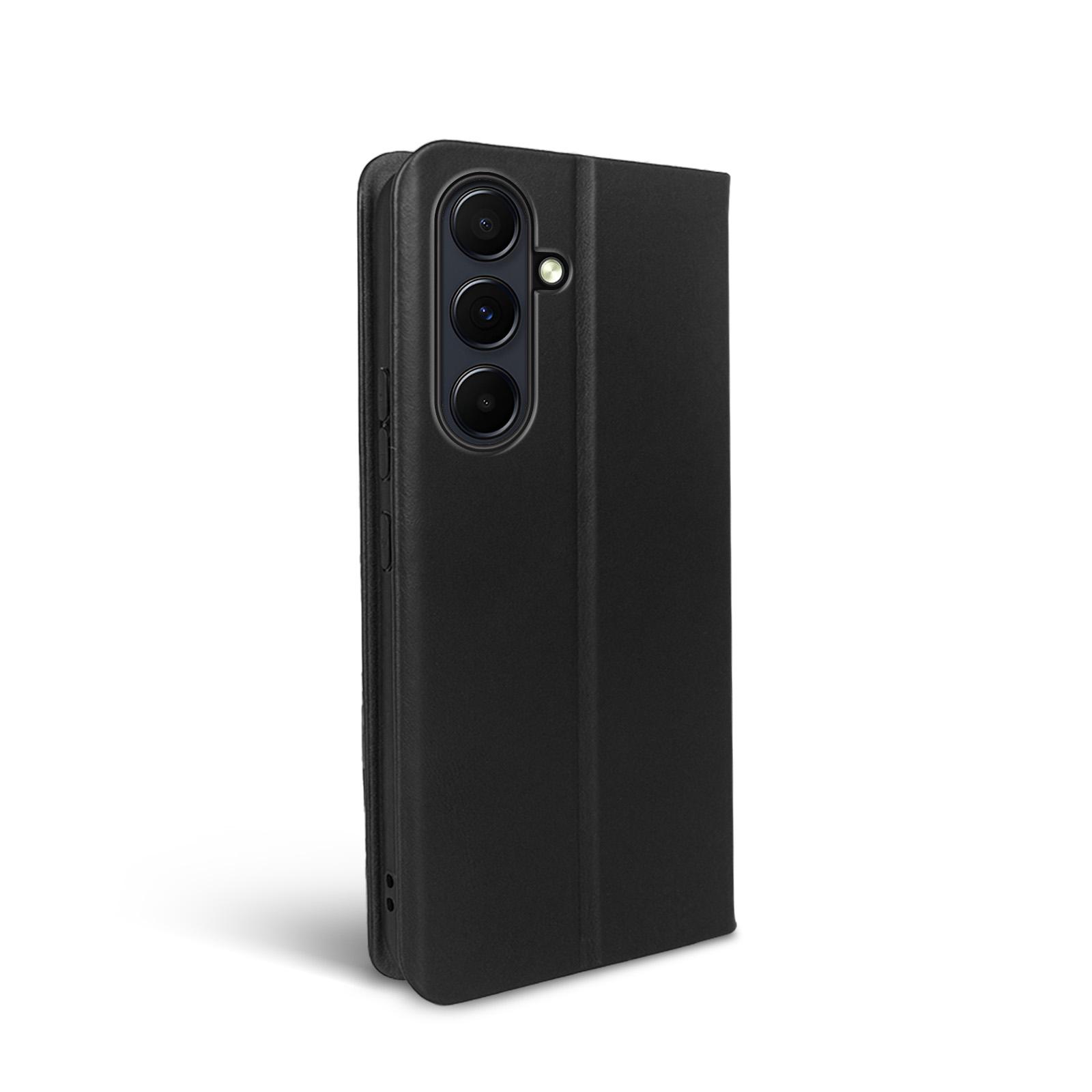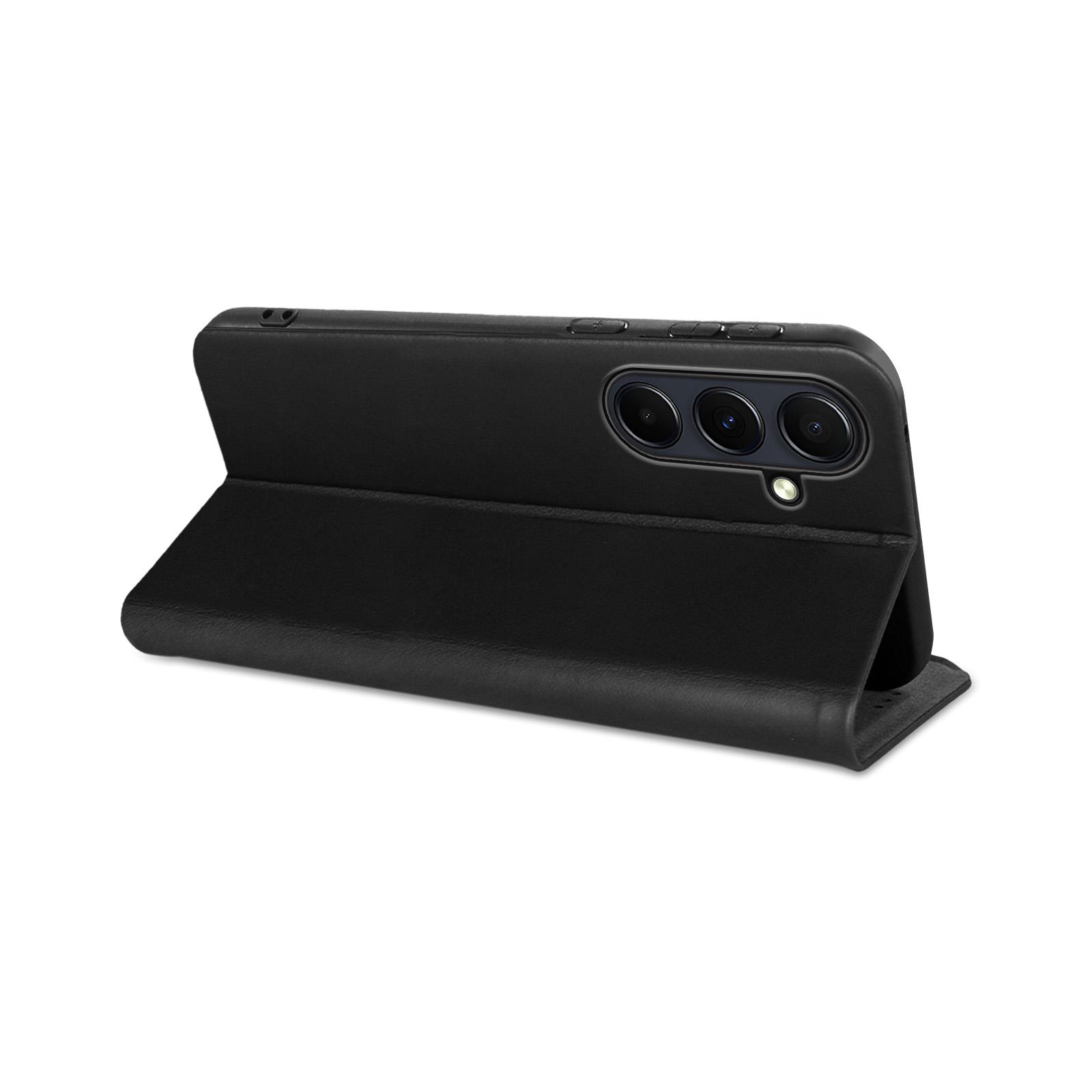 Hochwertige Klapphülle aus Leder für Samsung Galaxy S24 FE wahweise mit 9H Displayglas - Exakte Passgenauigkeit durch verstärkte Kunststoffschale (Schwarz) - Integrierte RFID Schutzschicht - Smartes Design mit Kartenfach - Praktische Smartstand-Funktion - Schneller Blitzversand und engagierter Kundendienst an 7 Tagen die Woche!.