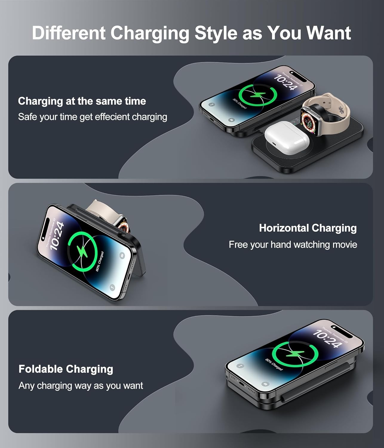 Mit ihrer kompakten und faltbaren Bauweise ist sie der ideale Begleiter für unterwegs, auf Reisen oder den täglichen Einsatz zu Hause und im Büro. Sie ist vollständig kompatibel mit der iPhone 15/14/13/12 Serie, der Apple Watch Ultra/9/8/7/6/SE/5/4/3/2 sowie AirPods Pro, AirPods 3 und AirPods 2 mit kabellosem Ladecase.